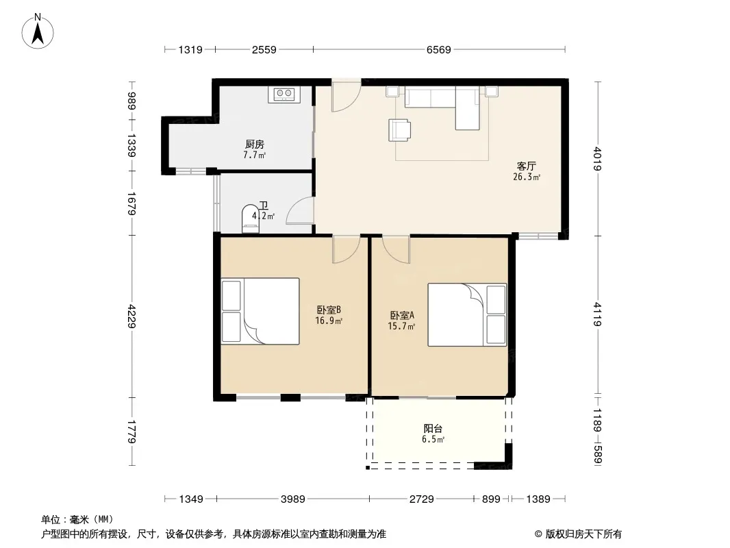 户型齐全,主打户型方正,明卫,明厨,客厅朝南,主卧朝南二居