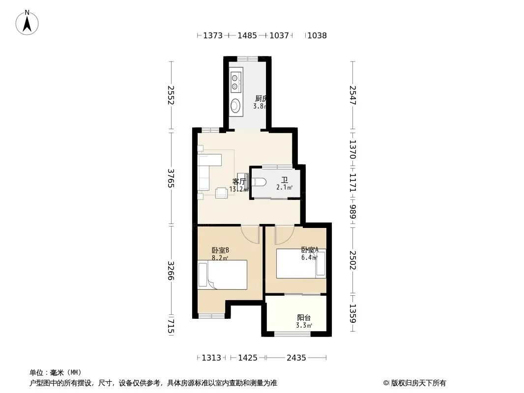 户型齐全,主打户型方正,明卫,明厨,客厅朝南,主卧朝南二居