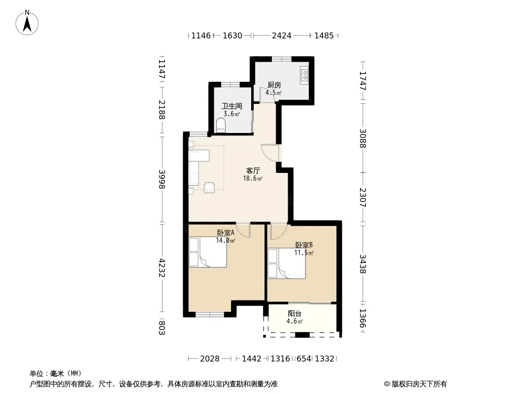 户型齐全,主打户型方正,明卫,明厨,客厅朝南,主卧朝南二居