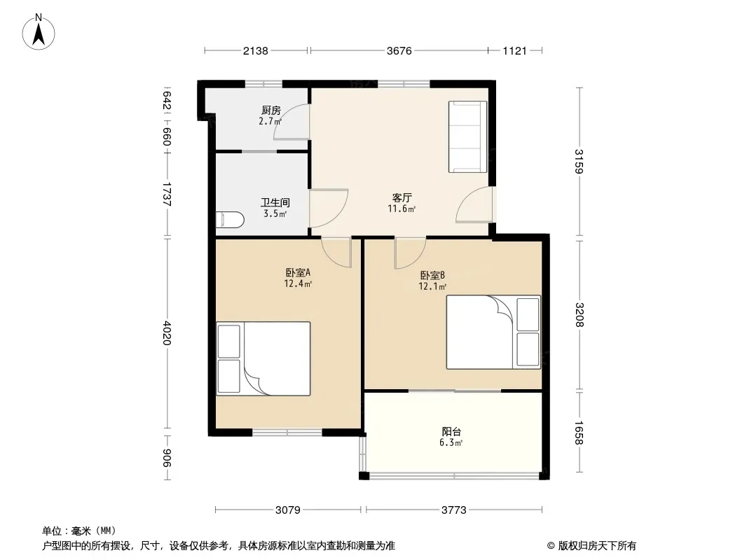 户型齐全,主打户型方正,明厨,客厅朝南,主卧朝南二居