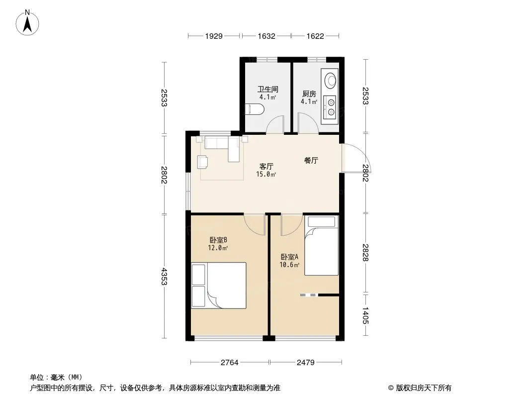 户型齐全,主打户型方正,明卫,明厨,客厅朝南,主卧朝南二居