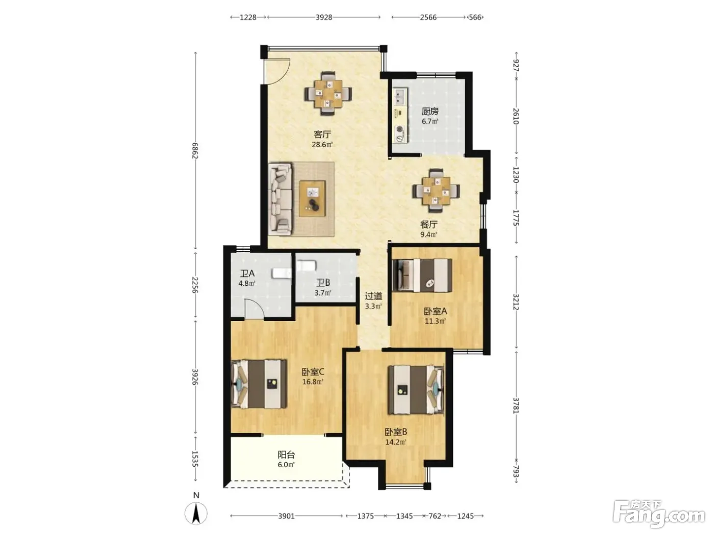 户型齐全,主打户型方正,明厨,明卫,客厅朝南三居