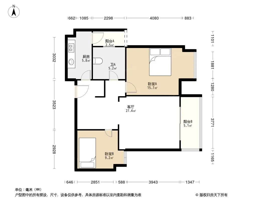 户型齐全,主打户型方正,明卫,明厨,主卧朝南二居