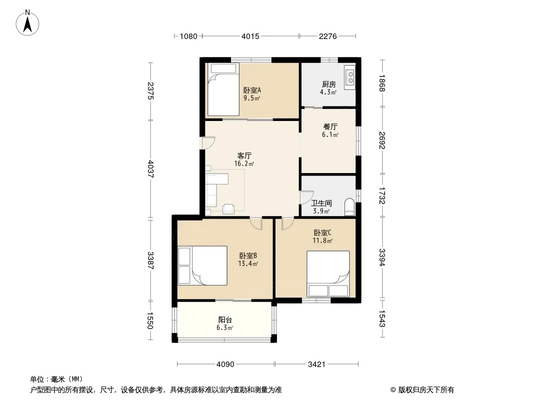 户型齐全,主打户型方正,明卫,明厨,双卧朝南三居