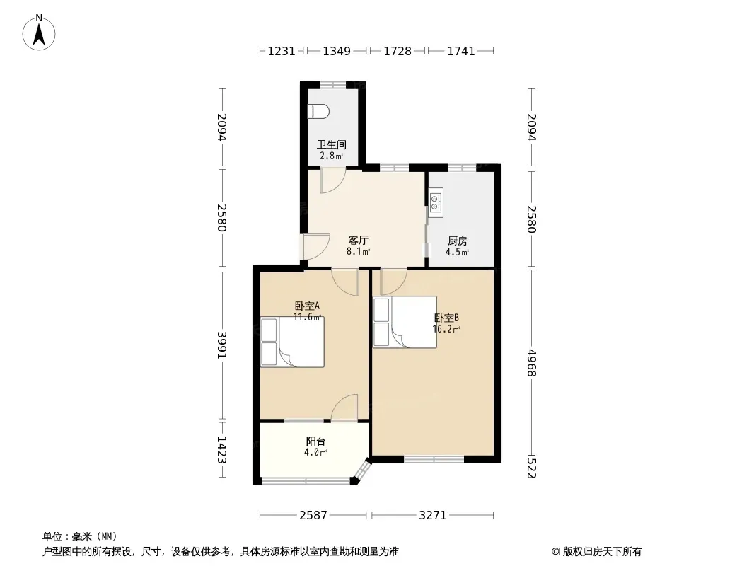 户型齐全,主打户型方正,明卫,明厨,客厅朝南,主卧朝南二居