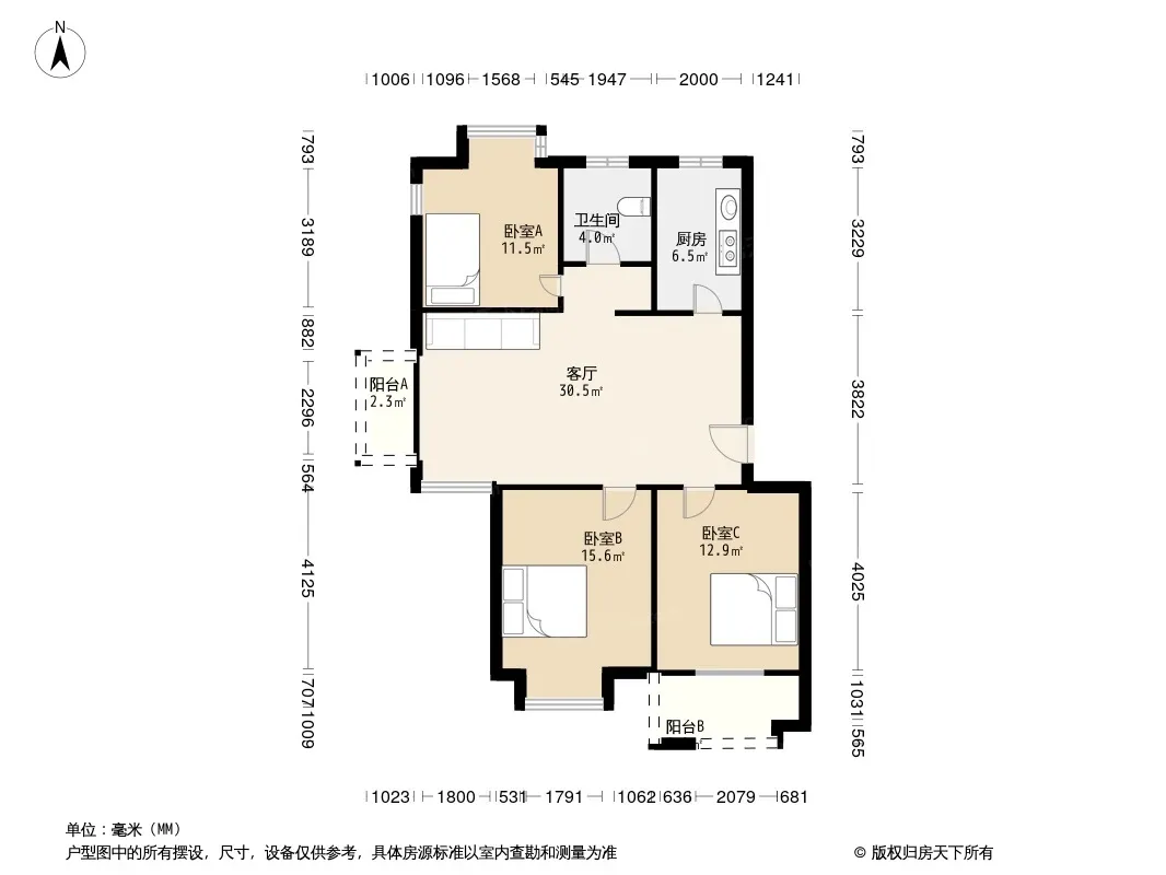 户型齐全,主打户型方正,明卫,明厨,客厅朝南,主卧朝南三居