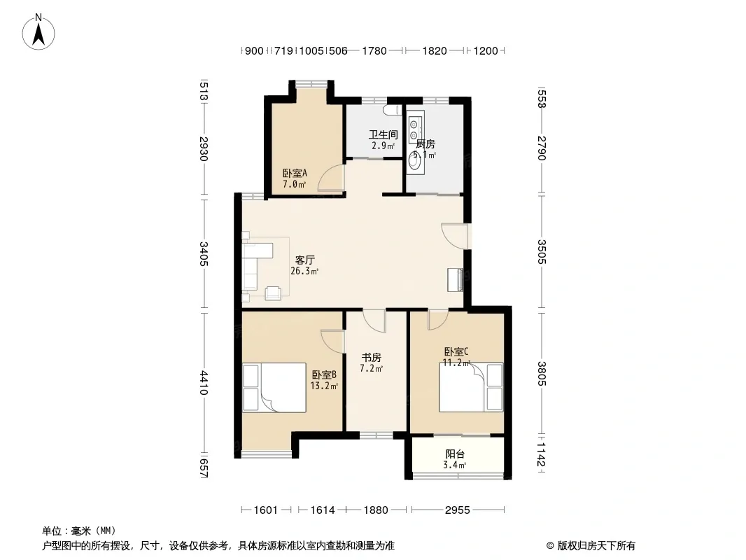 户型齐全,主打明厨,明卫,客厅朝南,全明格局三居