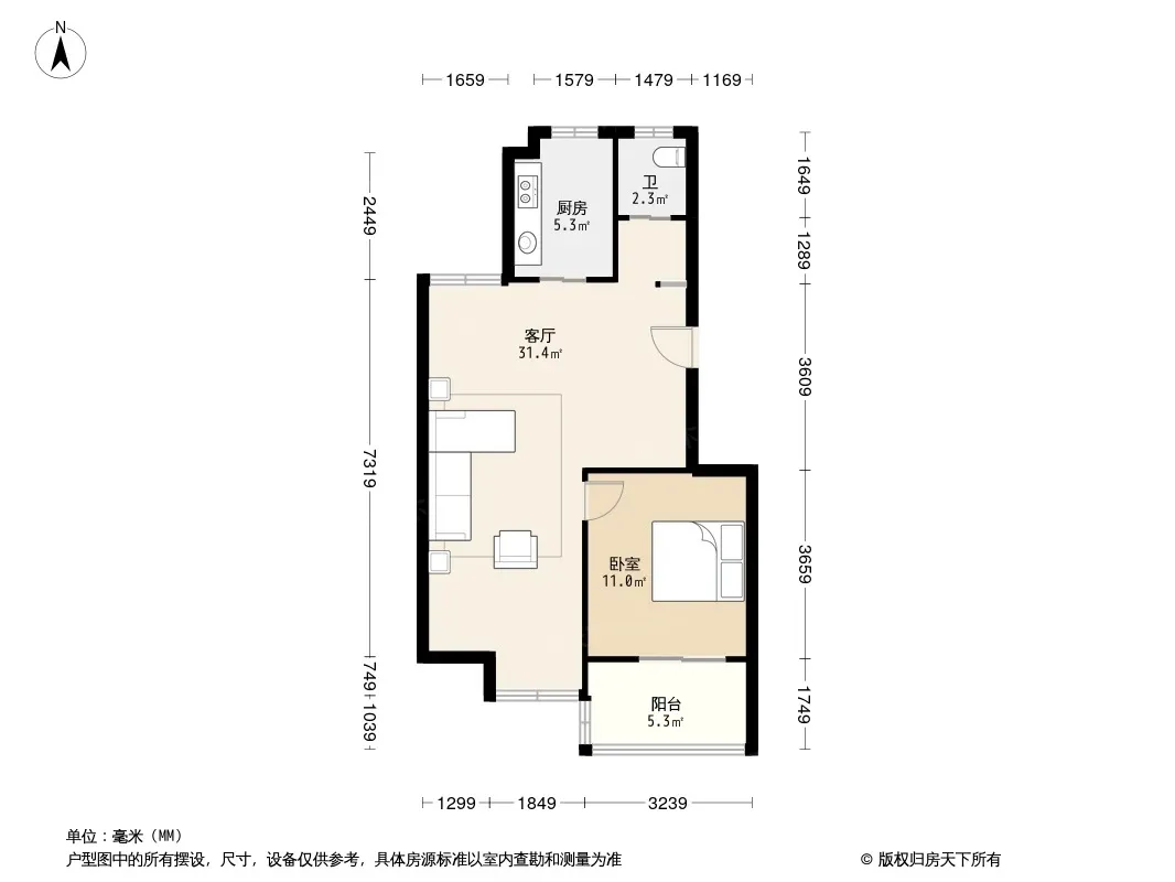 户型齐全,主打明卫,明厨,客厅朝南,主卧朝南二居