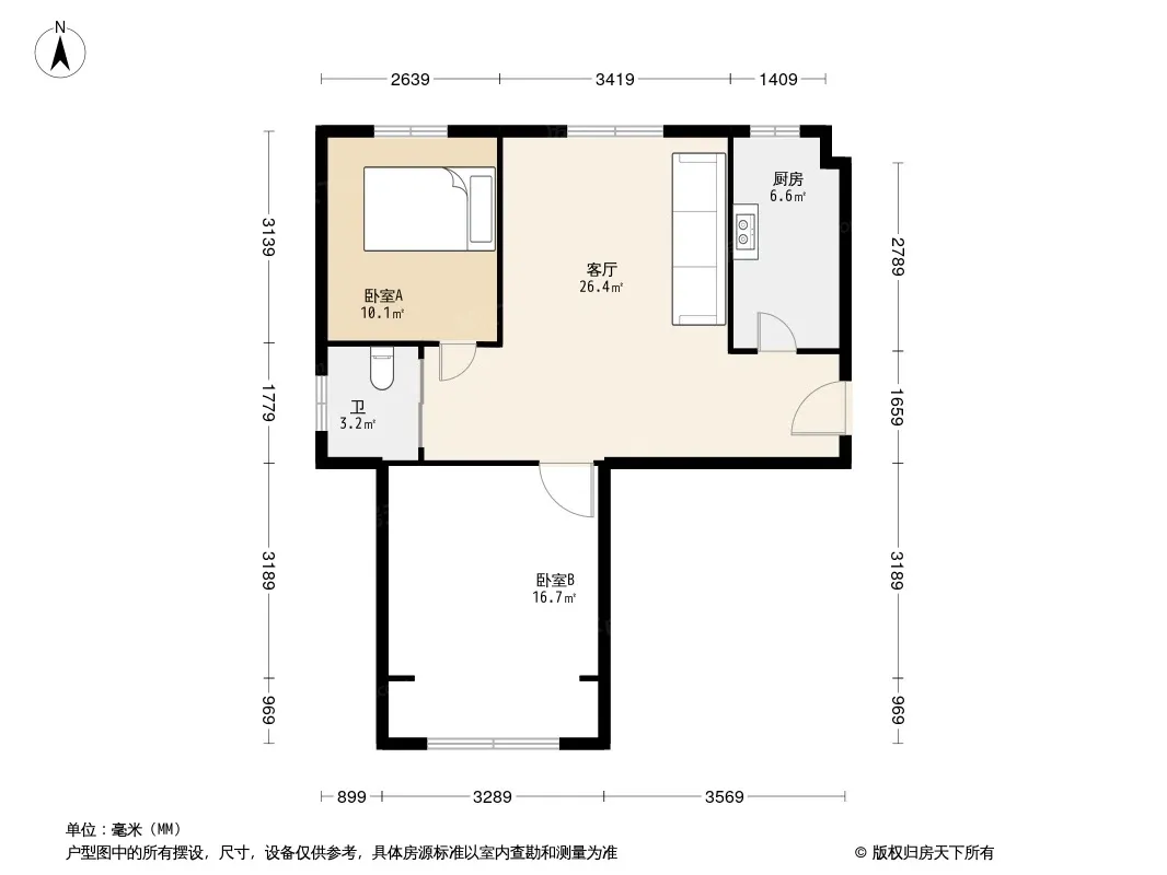 户型齐全,主打户型方正,明卫,明厨,客厅朝南,主卧朝南二居