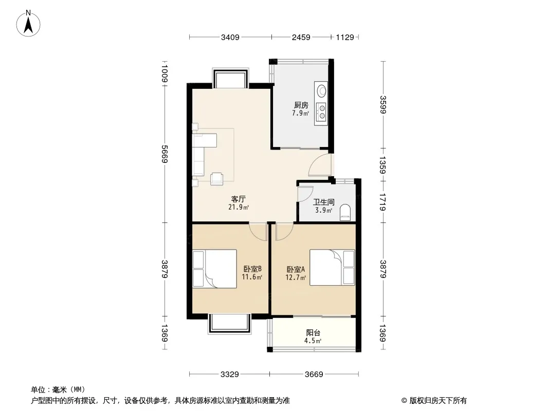 户型齐全,主打户型方正,明卫,明厨,客厅朝南,主卧朝南二居