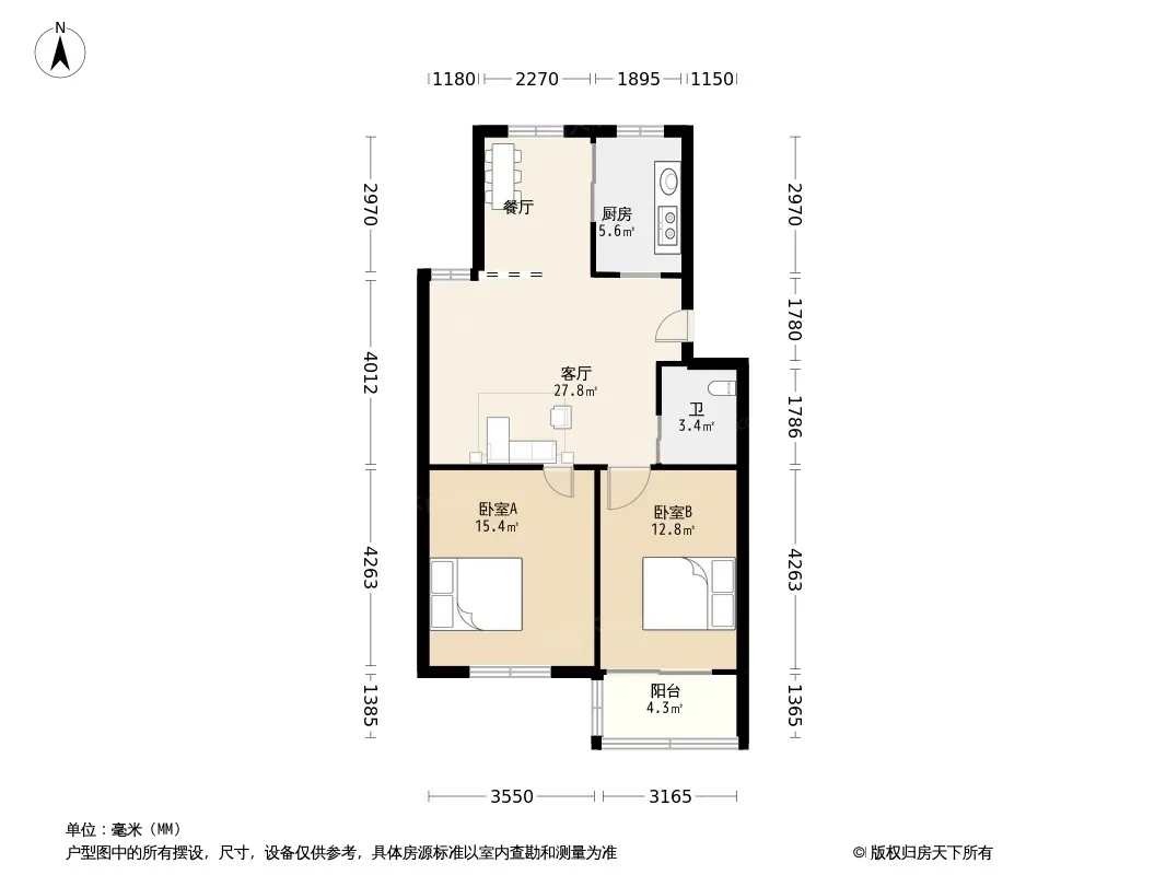 户型齐全,主打户型方正,明厨,客厅朝南,主卧朝南二居