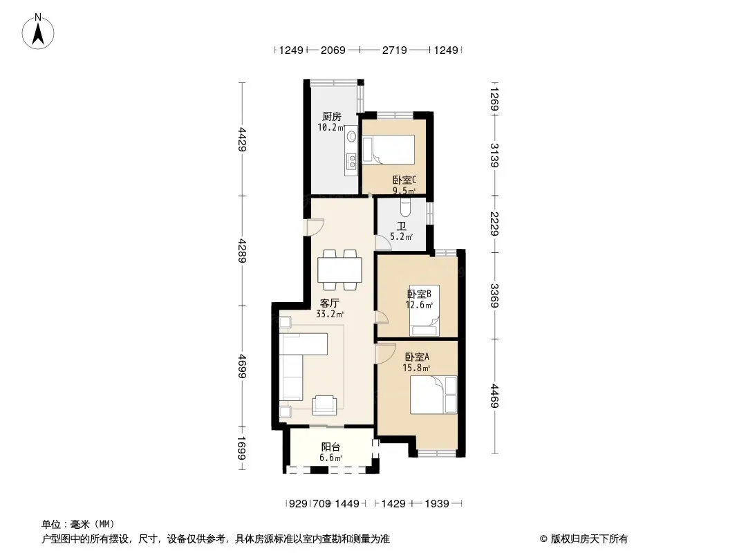 户型齐全,主打户型方正,明卫,明厨,主卧朝南三居