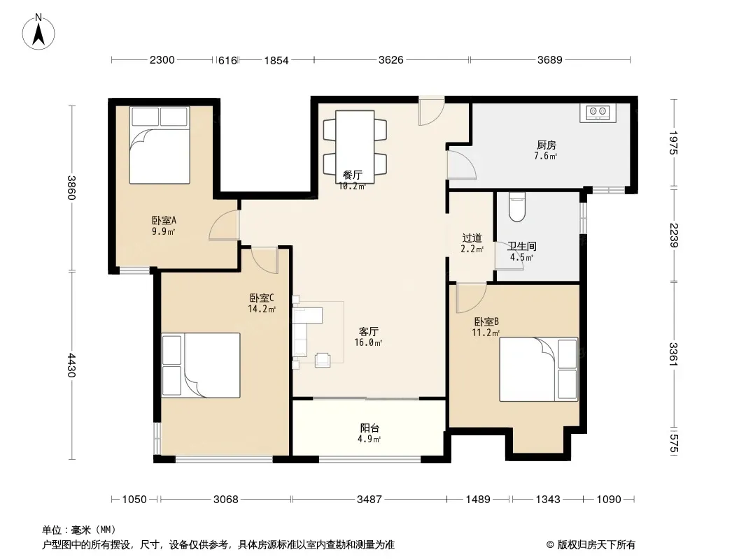 户型齐全,主打户型方正,明卫,明厨,客厅朝南,主卧朝南三居