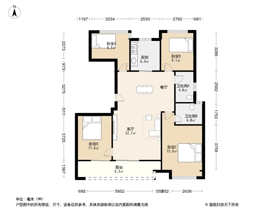 户型齐全,主打主卧带卫,客厅朝南,主卧朝南,观景飘窗,带衣帽间,全明格局,干湿分离,卧室带阳台四居