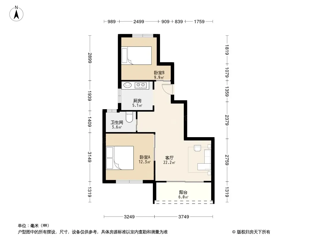 户型齐全,主打户型方正,明卫,明厨,主卧朝南二居