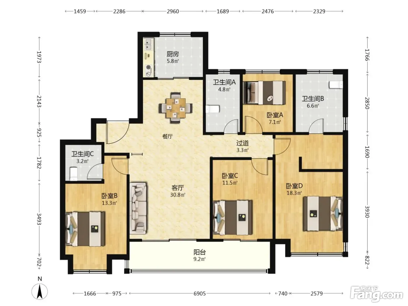 户型齐全,主打南北通透,全明格局四居