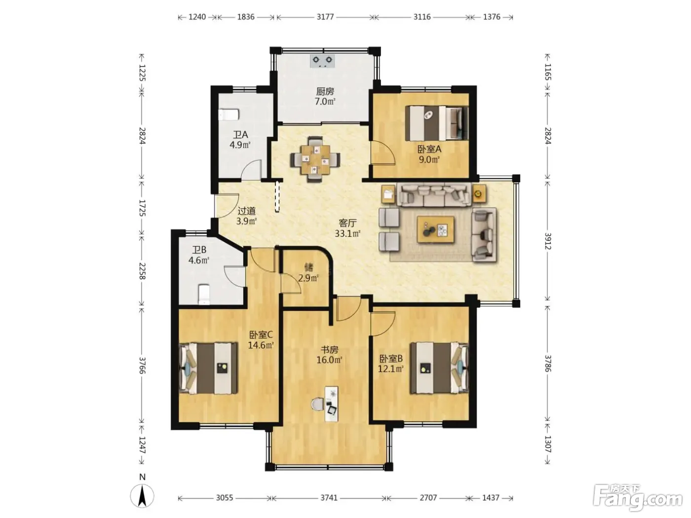 户型齐全,主打户型方正,明厨,明卫,客厅朝南,主卧朝南三居