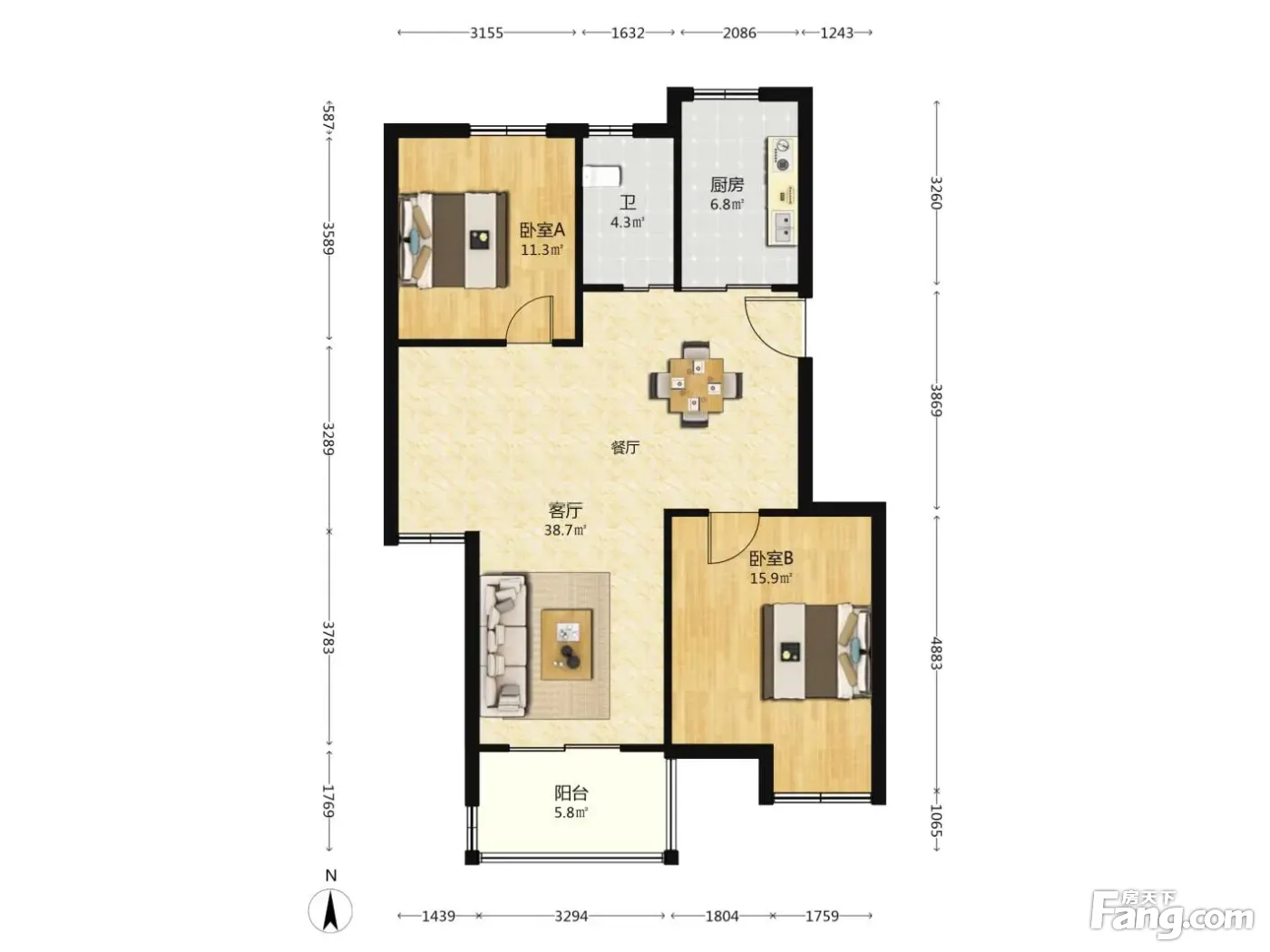 户型齐全,主打明厨,明卫,客厅朝南,全明格局,主卧朝南二居