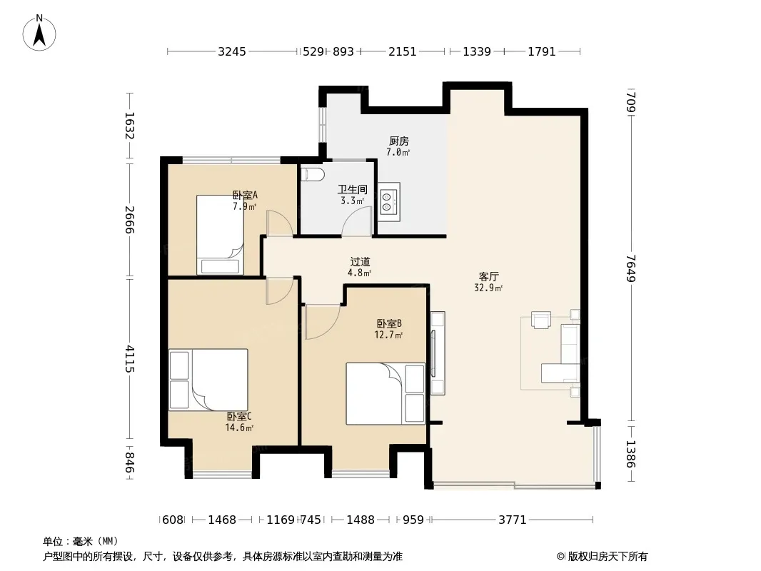 户型齐全,主打户型方正,明卫,明厨,客厅朝南,双阳台三居