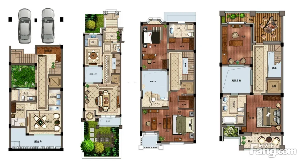 上下6层联排别墅,地上4层,赠送地下2层,送南、北面大花园150平,正规5房,已预留电梯井的位置,采光超棒,全天太阳无挡。