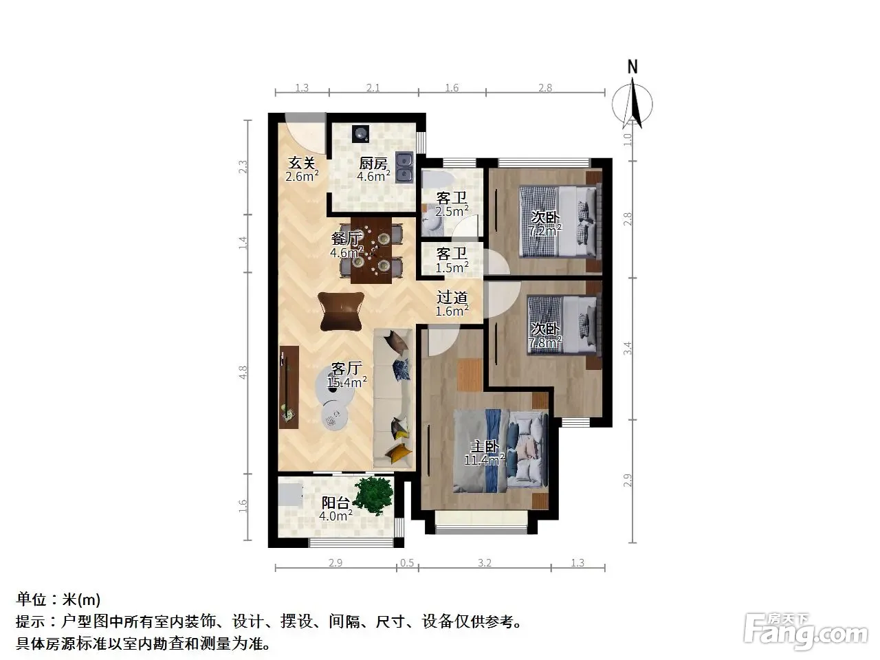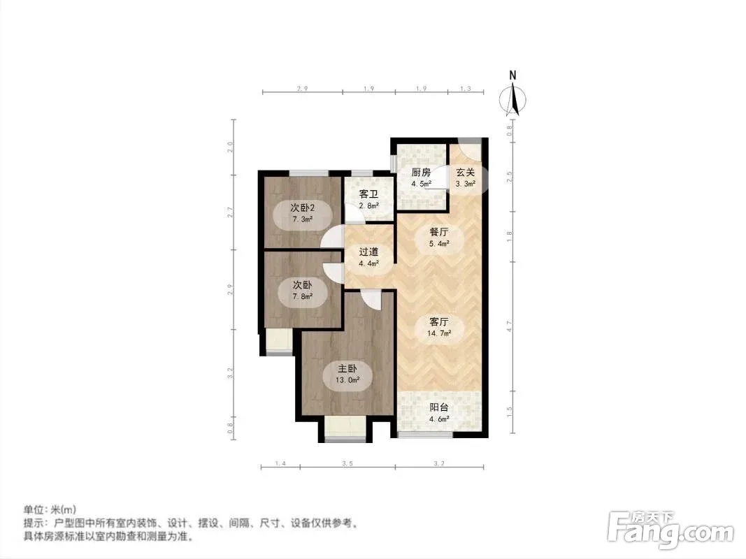 3室2厅1卫,建筑面积:98.51平米,朝向为南北向