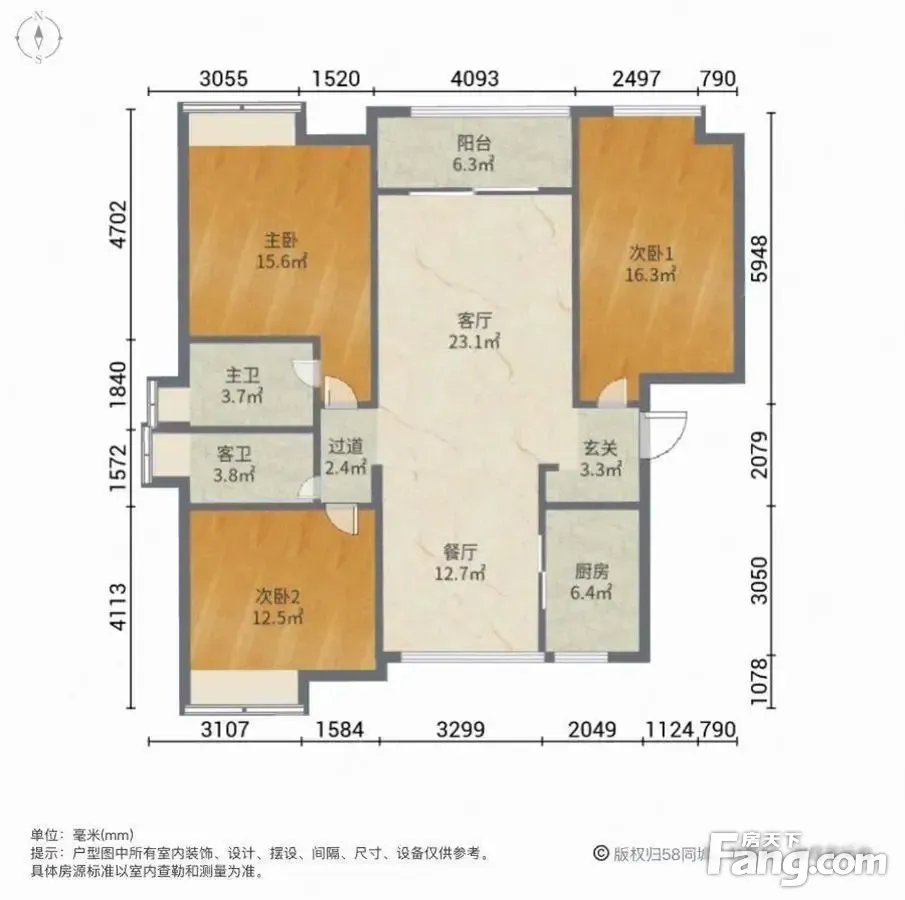 户型齐全,主打客厅朝南,卧室朝南,干湿分离三居