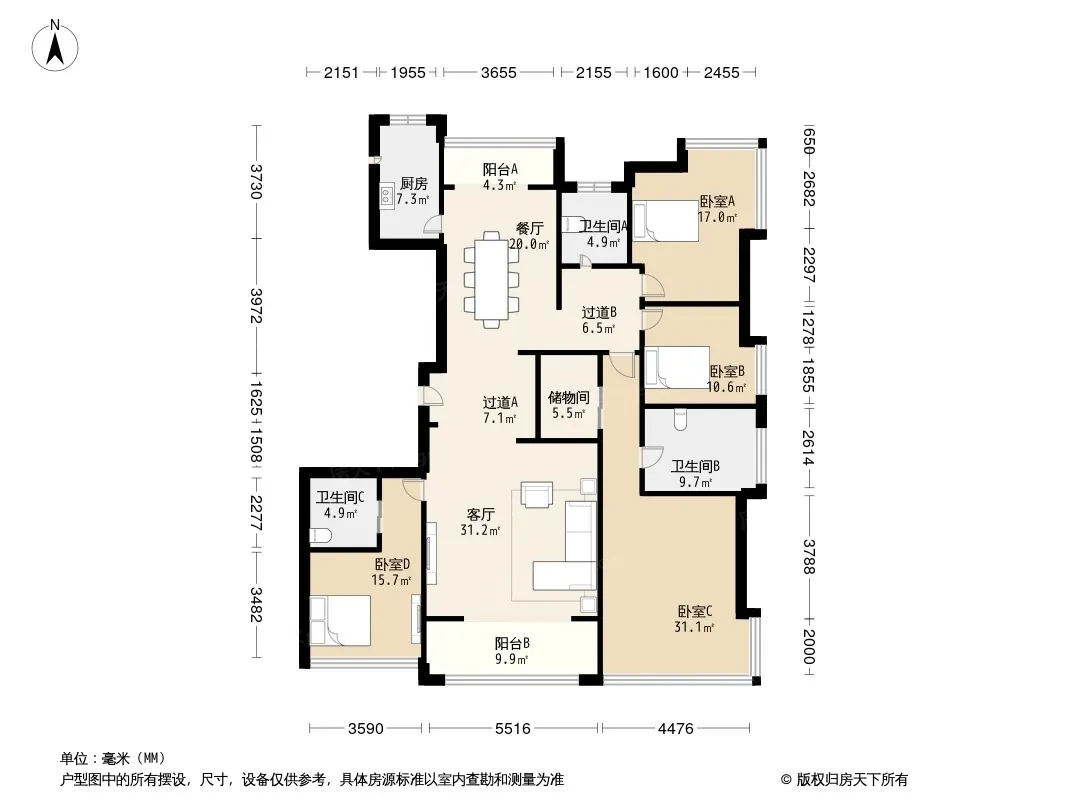 户型齐全,主打明卫,独立衣帽间,主卧朝南四居