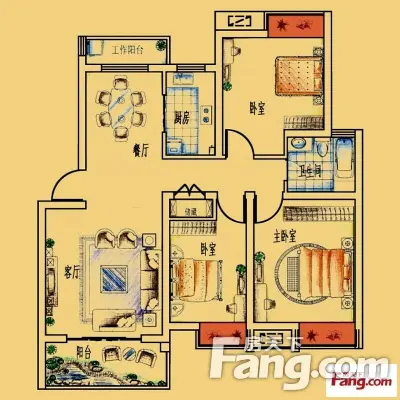户型齐全,主打户型方正,明卫,明厨,客厅朝南,主卧朝南三居