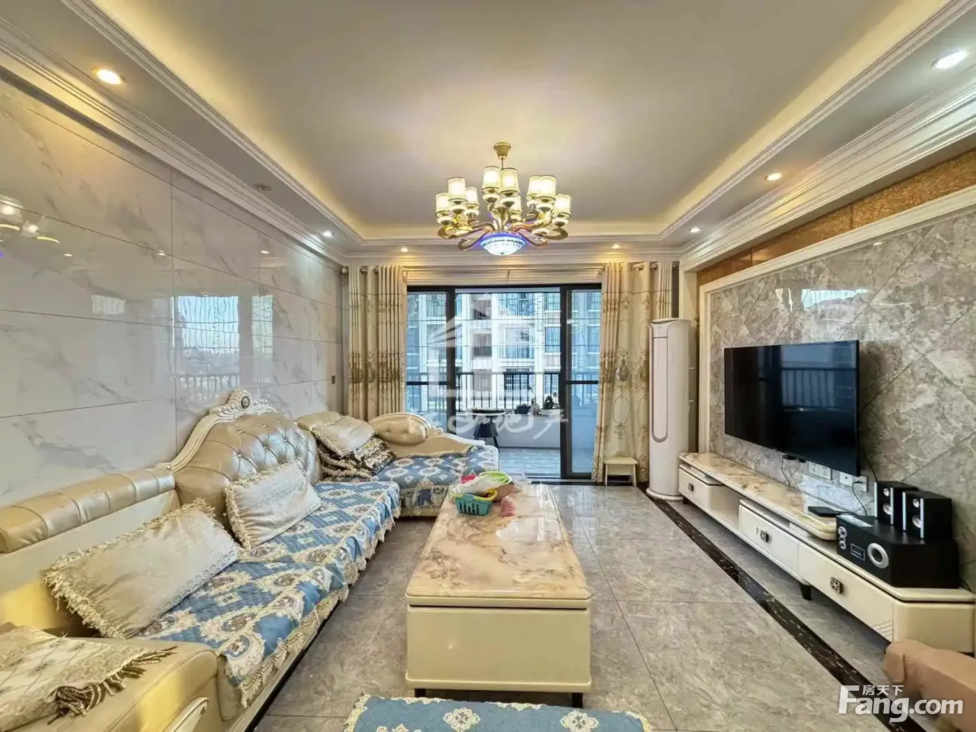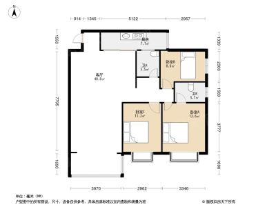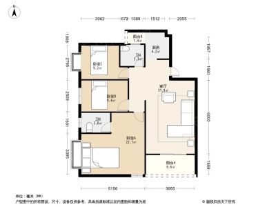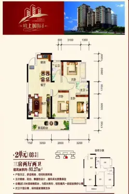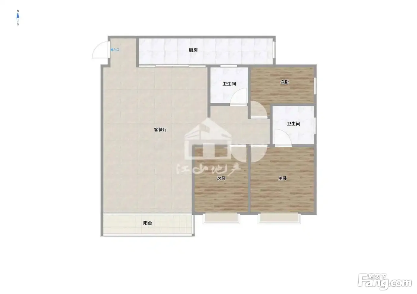 3房2厅2卫,厅出阳台。户型方正,朝南向。