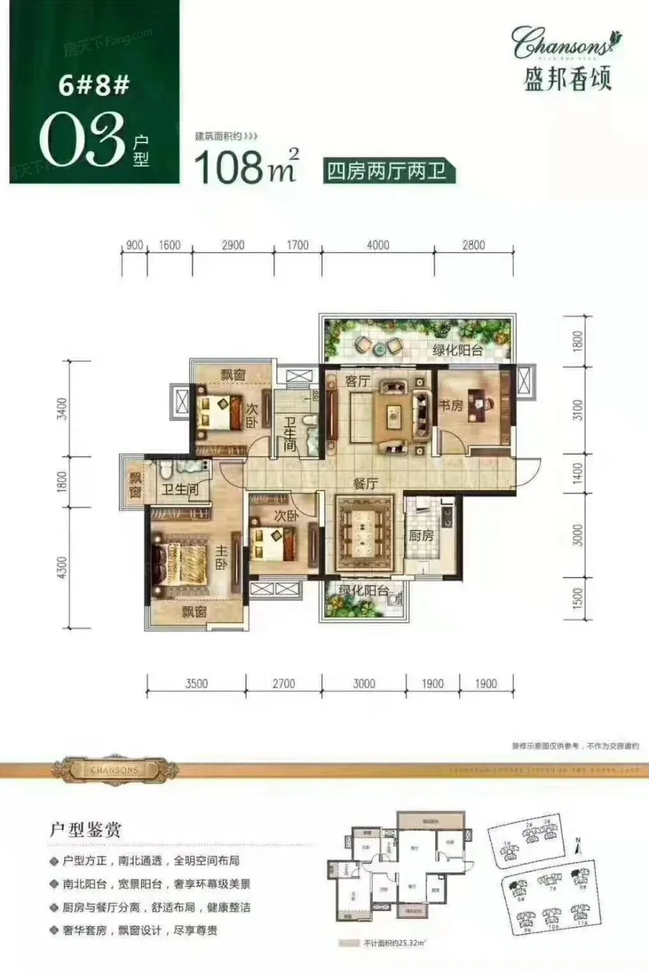 盛邦香颂户型主要有99平-115平的户型方正,明卫,双卧朝南,主卧朝南的四居 、116平-118平的明厨,明卫,双阳台,双卧朝南的五居 。