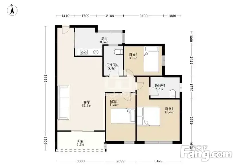 户型齐全,主打户型方正,明卫,客厅朝南,双阳台三居