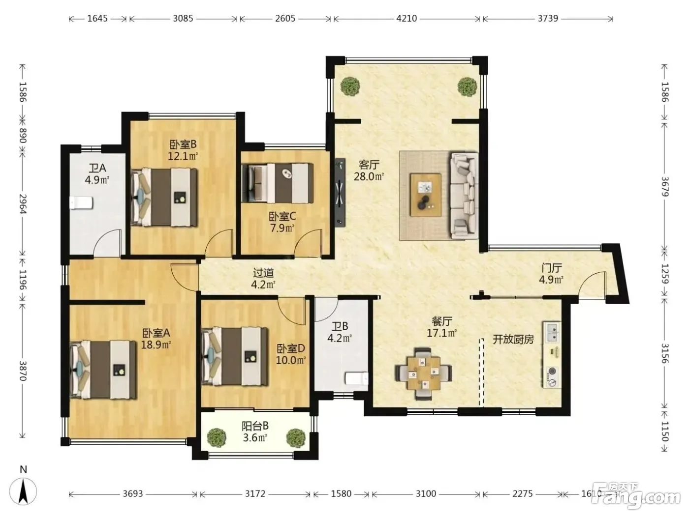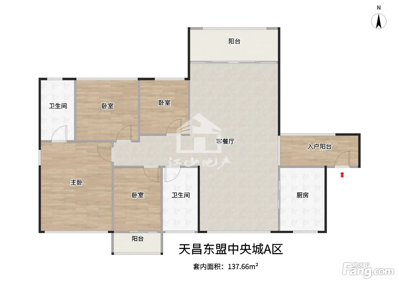 产权面积137平 4房双阳台朝北看小区 、高层2梯4户、家具家电全送房拎包入住、采光通透