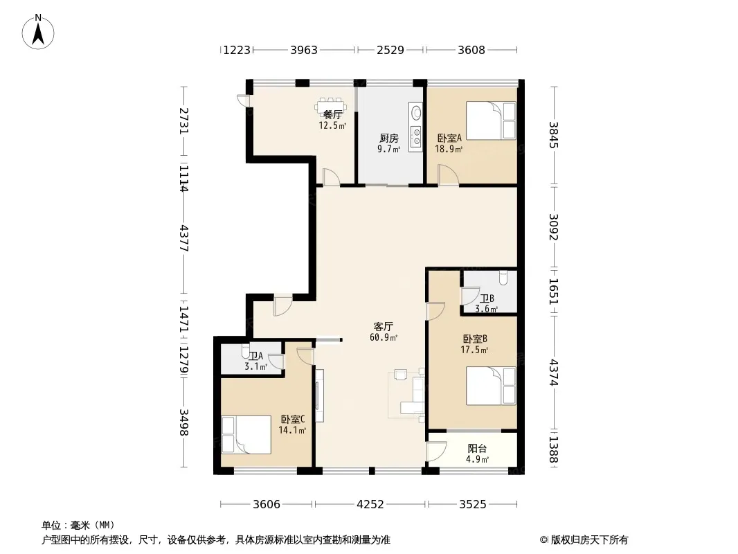 户型齐全,主打户型方正,明厨,客厅朝南,双阳台三居