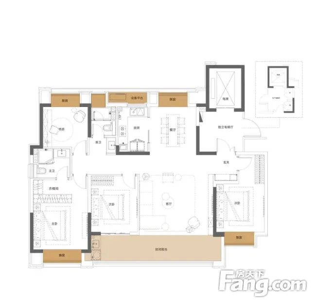大小面积都采用了双阳台的设计,让房子看起来更宽敞,户型方正,南北通透,动静分离,餐客一体,很好的利用了房子的空间面积。采光无任何遮挡