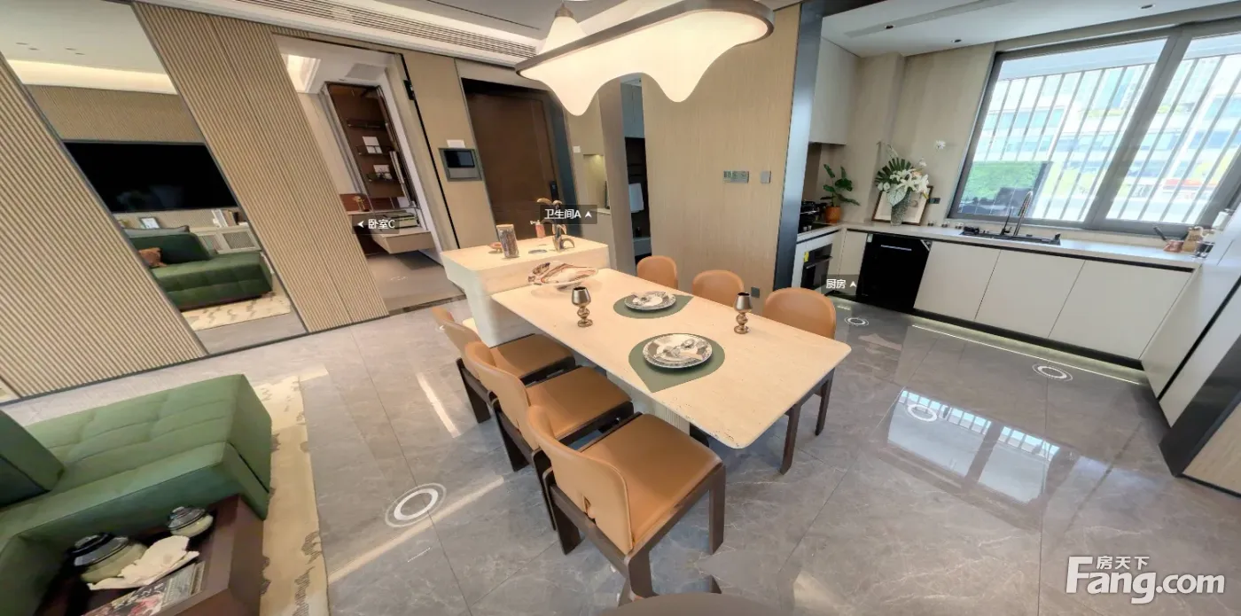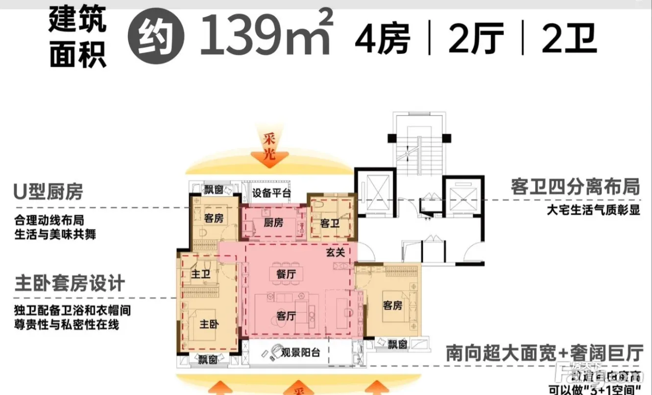 大小面积都采用了双阳台的设计,让房子看起来更宽敞,户型方正,南北通透,动静分离,餐客一体,很好的利用了房子的空间面积。采光无任何遮挡