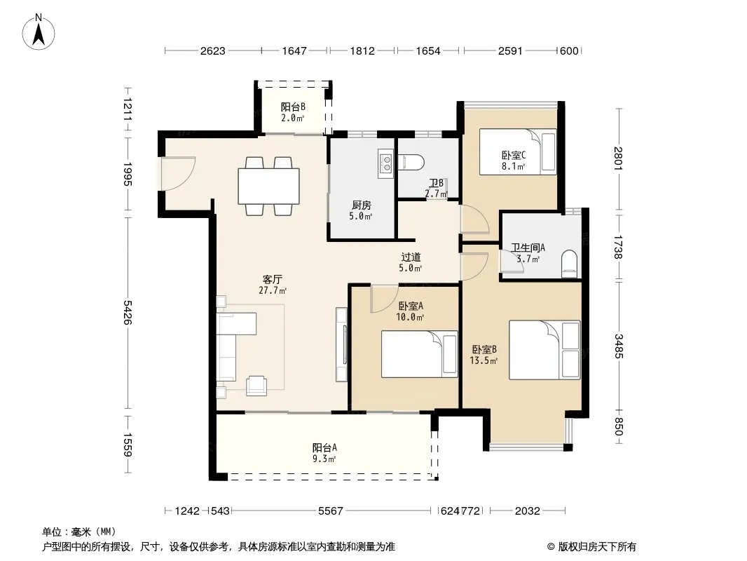 户型齐全,主打户型方正,明卫,明厨,双卧朝南,主卧朝南三居