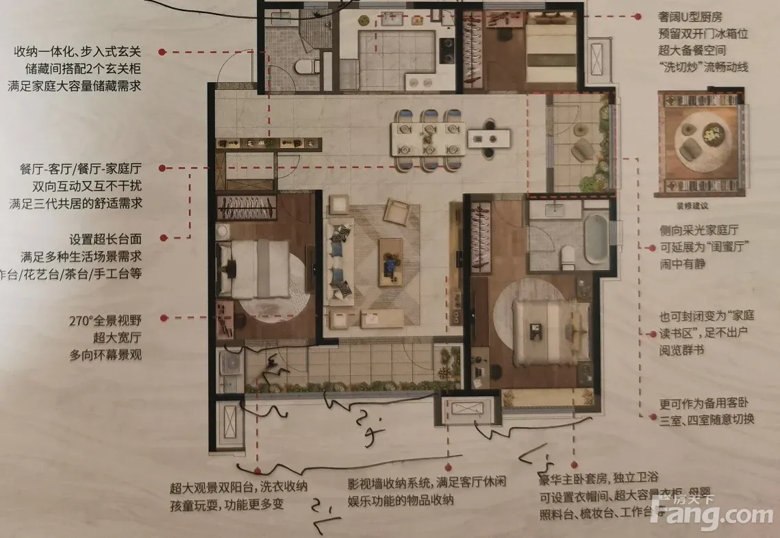 龙湖亿联·春江天玺户型主要有100平-135平的南北通透,客厅朝南的三居 、34平-34平的南北通透,全明格局的一居 、142平-142平的南北通透,客厅朝南的四居 。