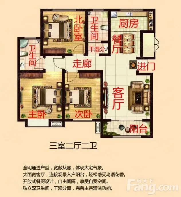 户型齐全,主打户型方正,明厨,明卫,客厅朝南,全明格局,主卧朝南二居