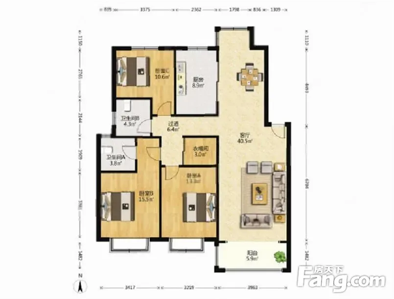 三房两厅两卫全明户型,双南卧一北卧南厅双卫全明户型