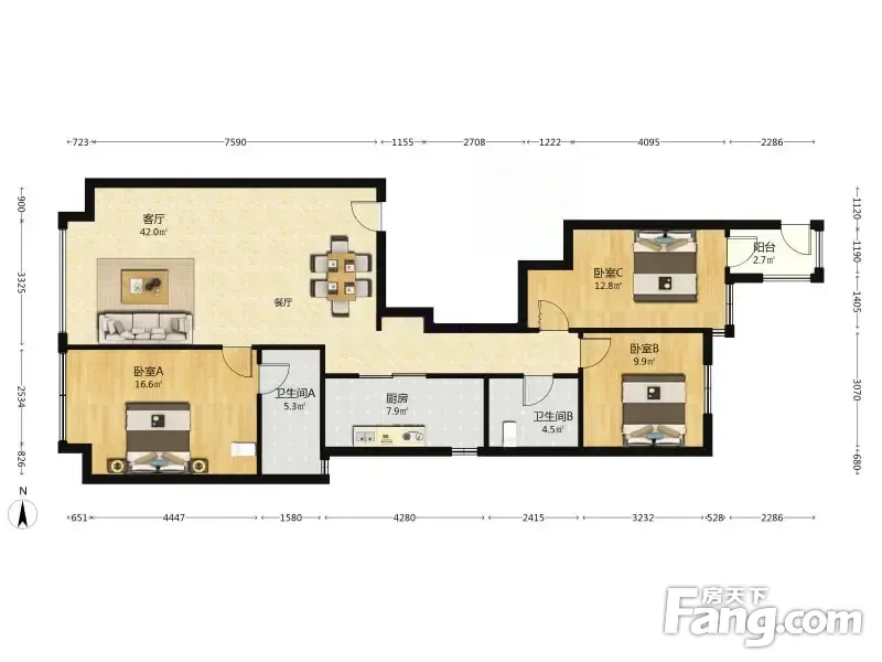 户型齐全,主打户型方正,独立衣帽间,明卫,客厅朝南,双卧朝南三居