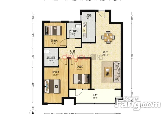 户型齐全,主打南北通透,客厅朝南三居
