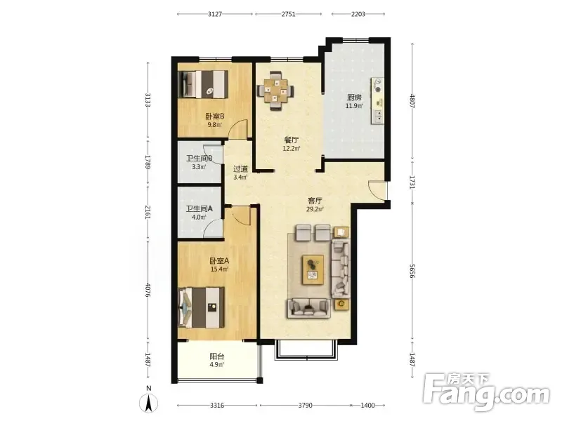 户型齐全,主打户型方正,明厨,主卧朝南二居