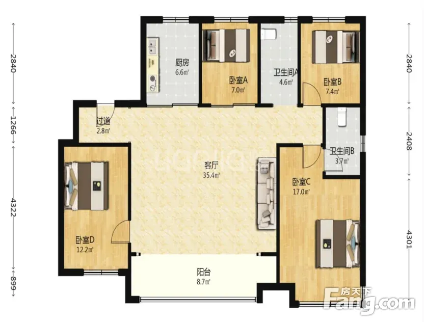 本房户型两南两北卧南厅,全明套四,户型方正。