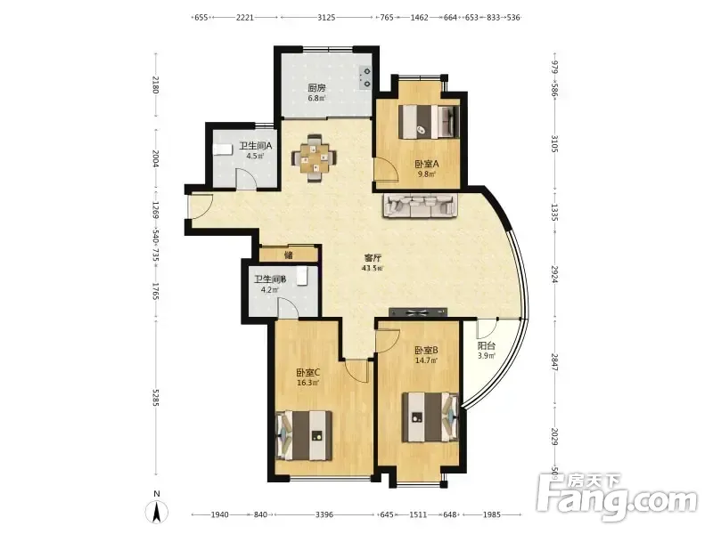 户型齐全,主打户型方正,明厨,客厅朝南,双卧朝南三居