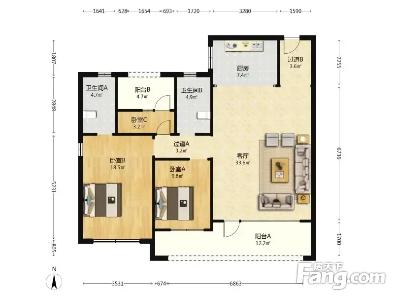 户型齐全,主打南北通透,客厅朝南三居