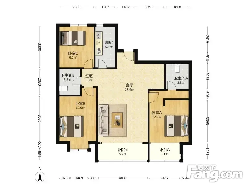 户型齐全,主打户型方正,明厨,客厅朝南,主卧朝南二居