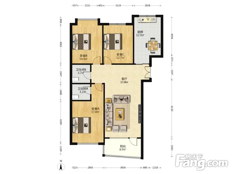 户型齐全,主打户型方正,明卫,明厨,主卧朝南三居