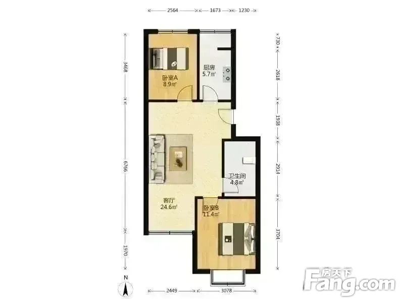 户型齐全,主打户型方正,明厨,客厅朝南,主卧朝南二居