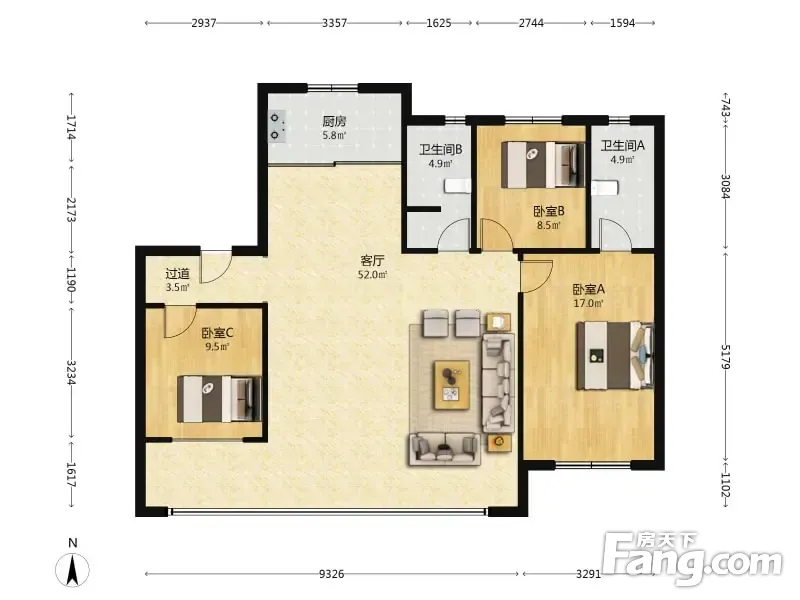 户型齐全,主打南北通透,客厅朝南三居