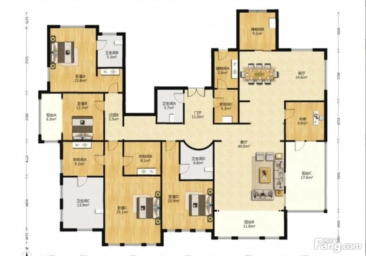五居四卫带二个独立衣帽间的大平层,60平大客厅、35平餐厅,南北通透,朝向良好,采光充足。户型设计合理,空间利用率大,楼层位置优越,功能间齐全,居住舒适度高。